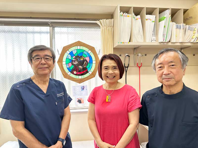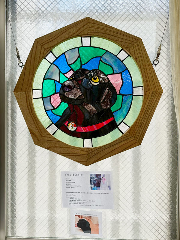 その温かなお心に感謝し、今回は特別にその木枠のひとつを使って、先生の愛犬「ローズ」をモチーフにしたステンドグラスを制作・寄贈いたしました。